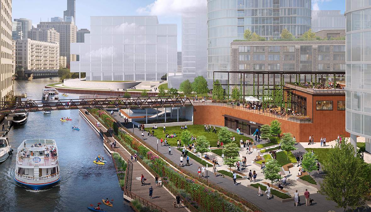 This high profile, highly visible redevelopment project in the heart of a burgeoning district in Chicago will become one of the premier live, work, play environments in the city. Surrounded by water on two sides, the development is well situated to be an icon. Striking plaza spaces, spacious lawns, and naturalized wetlands along with a highly stylized section of the Chicago Riverwalk will set the stage for this once in a lifetime opportunity to change the face of this portion of the city. Hitchcock Design Group collaborated with our architectural partners to conceptually land plan the site, situating multiple high-rise towers across the site to maximize views, consciously avoid casting shadows over the Riverwalk, and balancing the needs of access for residents, employees, shoppers, and the public who can enjoy every aspect of the open spaces we created. In addition, HDG prepared the Riverwalk and open space conceptual designs across the entire eight acres, capturing the essence of the city in the context of the neighborhood.